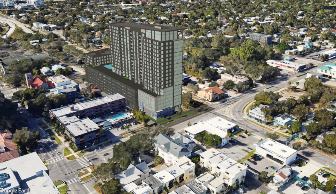 Stadler Development has filed plans to construct a 21-story residential tower on a 1.3-acre site along 5th Avenue North and 4th Street. The project sits within the Downtown St. Petersburg National Register Historic District, and will result in the demolition of seven structures, five of which are listed as contributing to the Historic District.